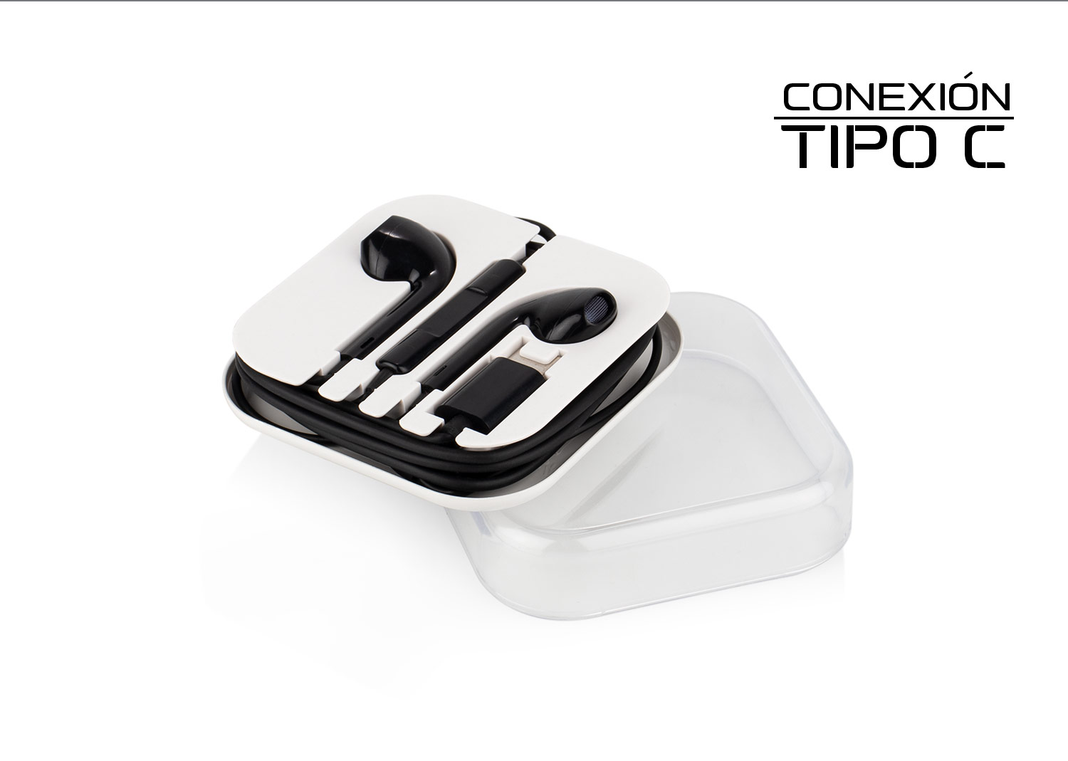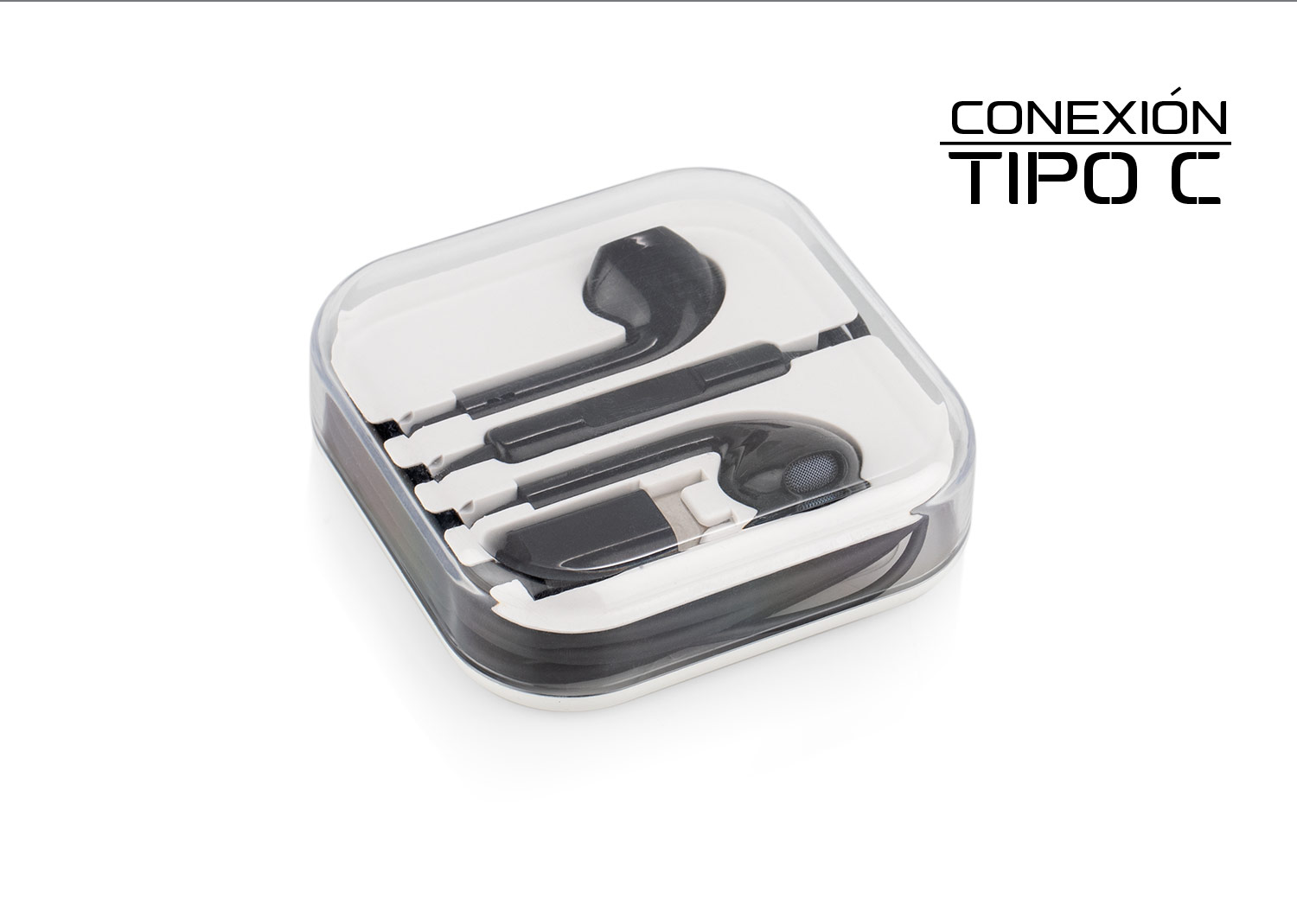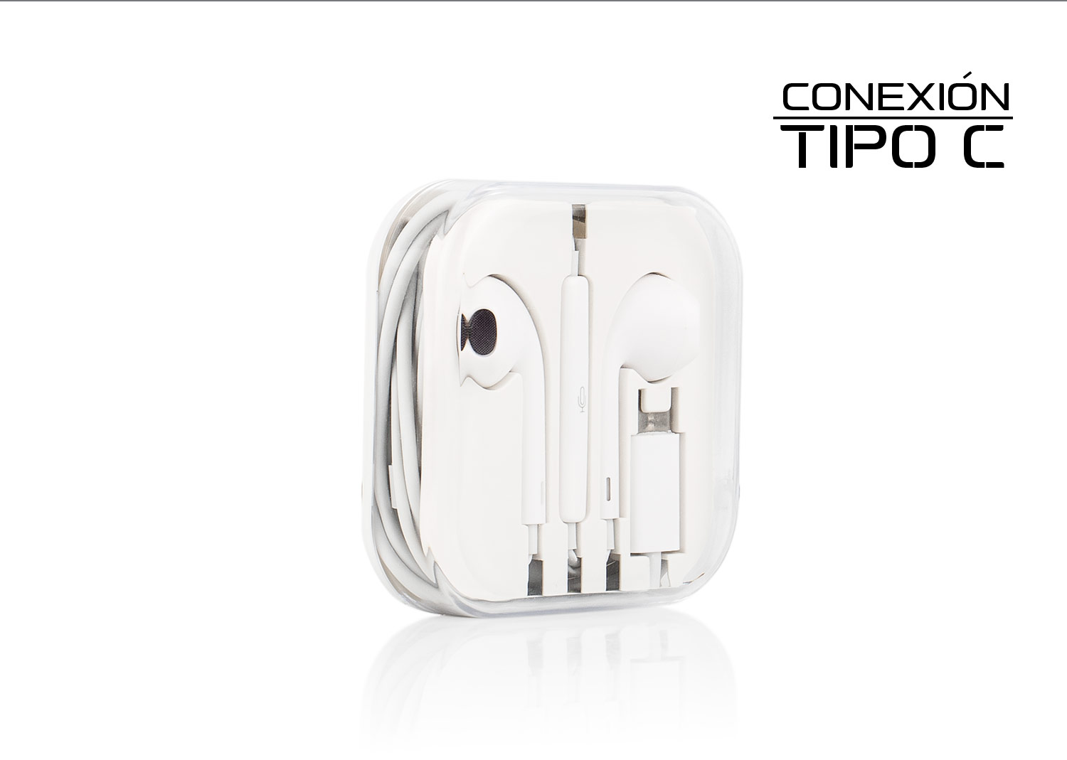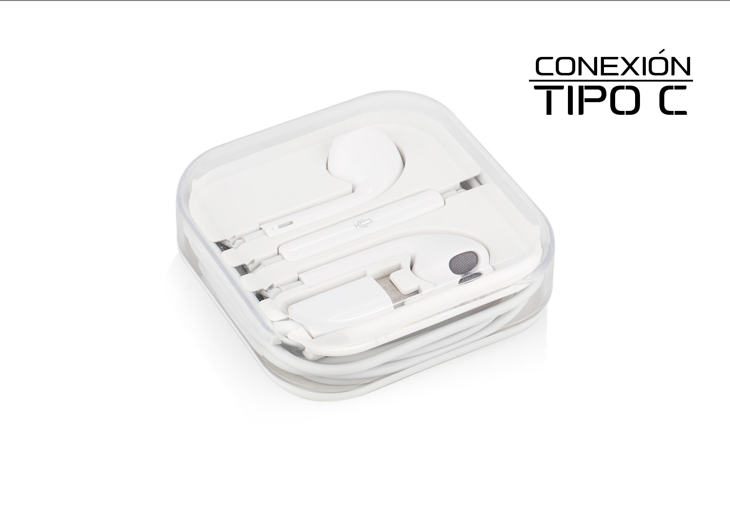 Audífonos alámbricos con control de volumen y micrófono para utilizar como manos libres, auriculares tipo botón. Conexión Tipo C.