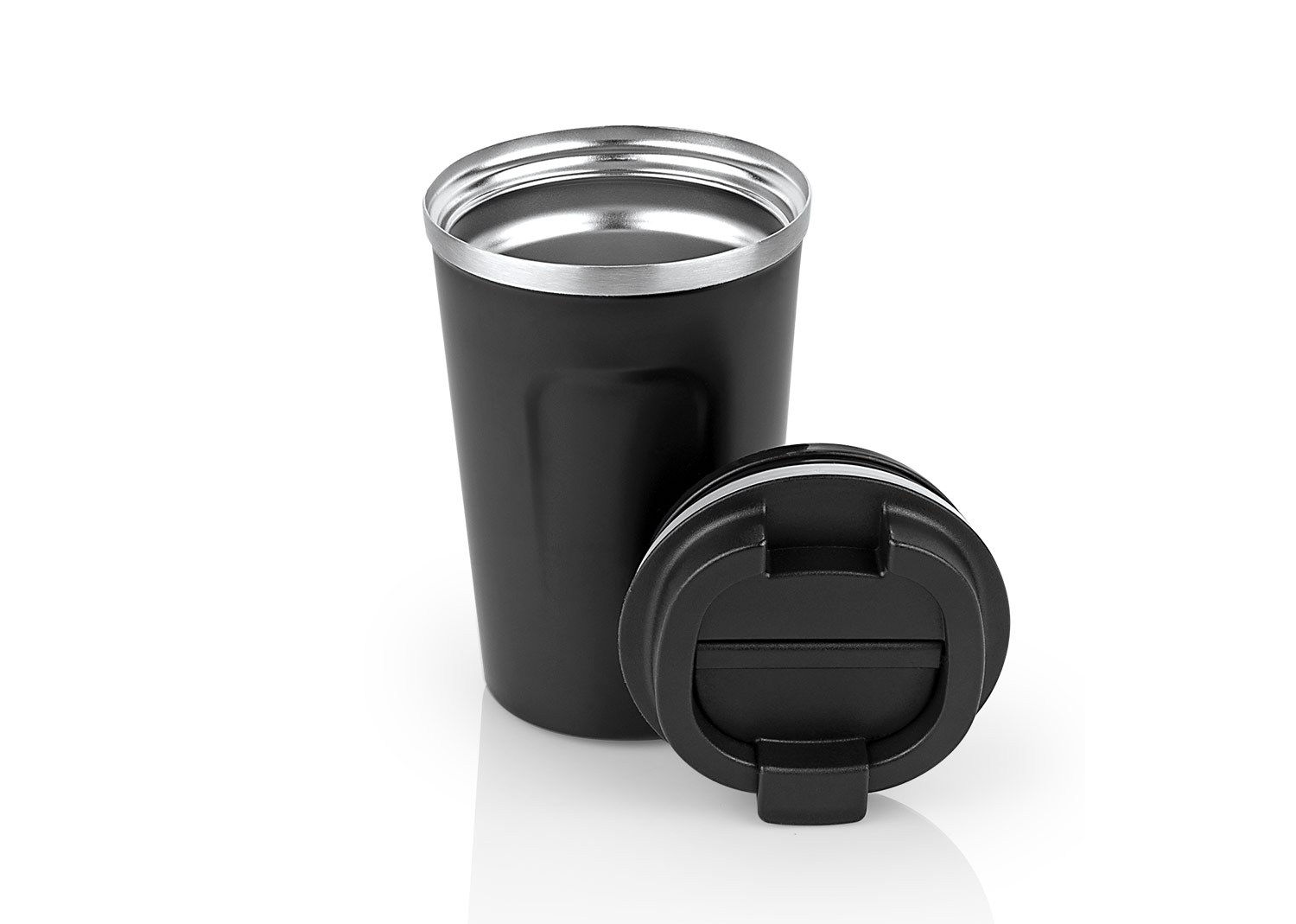 Mug doble pared en acero inoxidable, con aislamiento térmico Vacum y base antideslizante. Tapa rosca de seguridad y 500 ml / 17 Oz