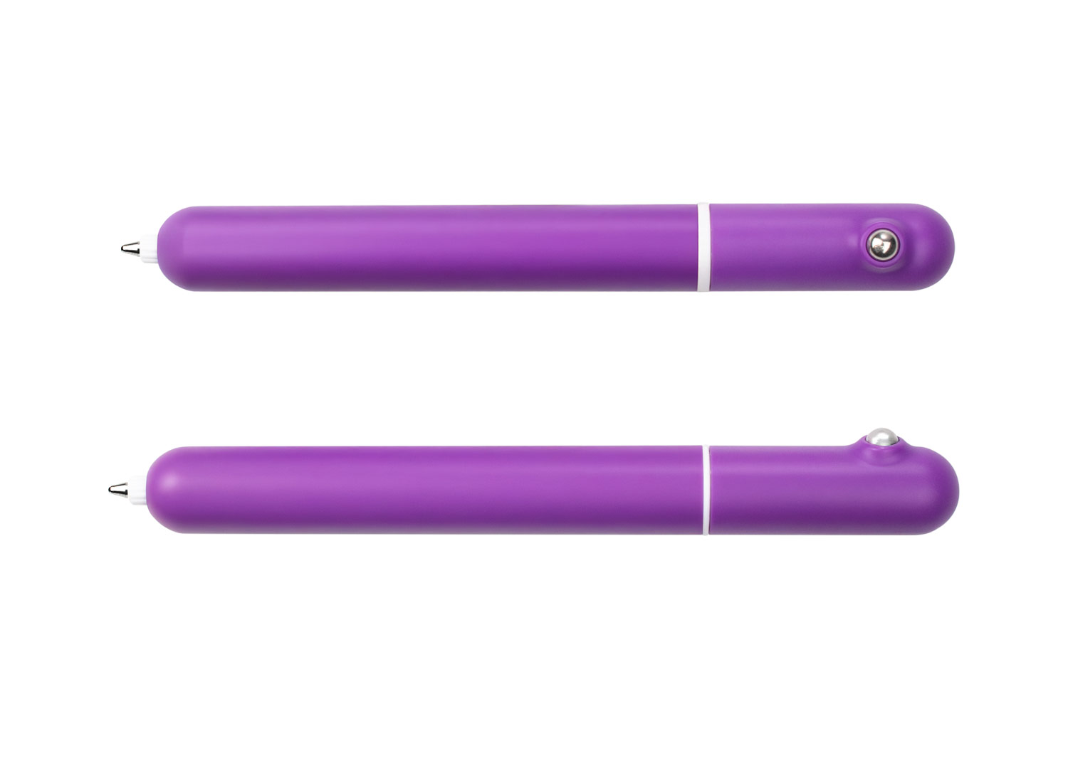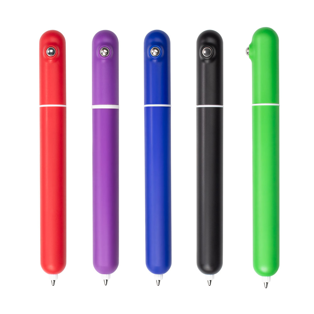 Bolígrafo con barril de color sólido y elegante anillo cromado. En la parte superior, incorpora una esfera metálica con función antiestrés, ideal para mantener las manos ocupadas durante la jornada. El sistema de giro activa la escritura de forma práctica y fluida. Un diseño moderno que combina funcionalidad y un toque interactivo.