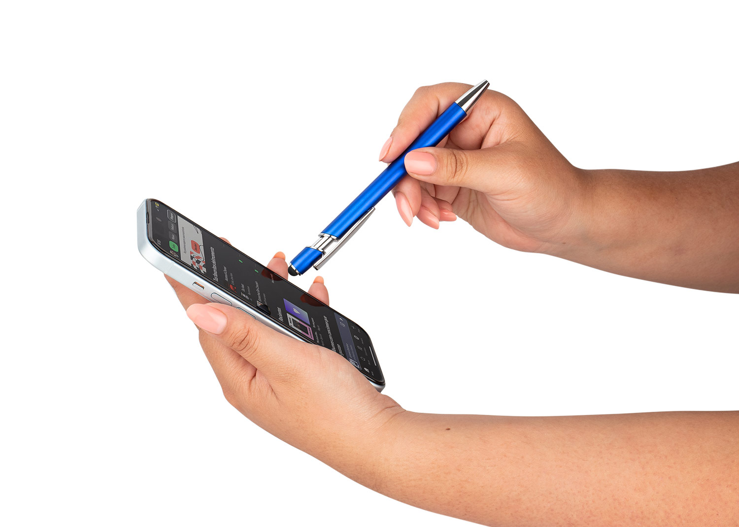 Bolígrafo de diseño moderno con barril y empujador de color metálico. Incorpora clip y adornos en metal cromado, que aportan un acabado elegante. En la parte superior, cuenta con función stylus compatible con pantallas táctiles. Mecanismo retráctil para mayor comodidad y funcionalidad.