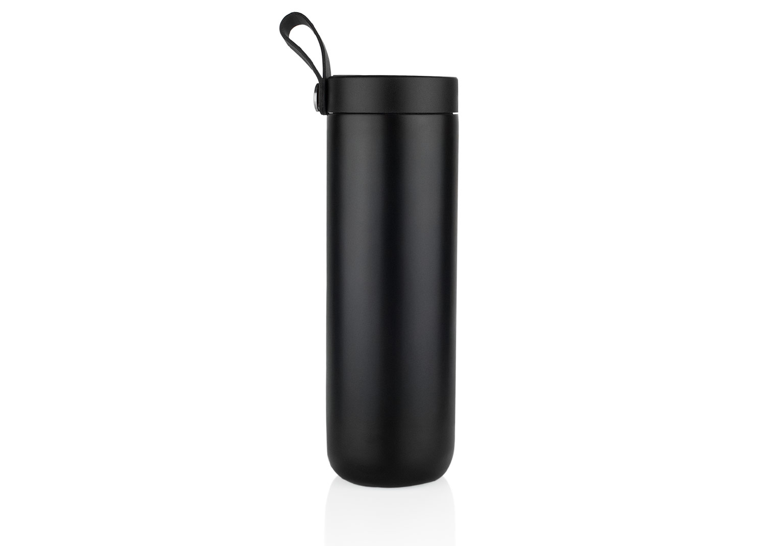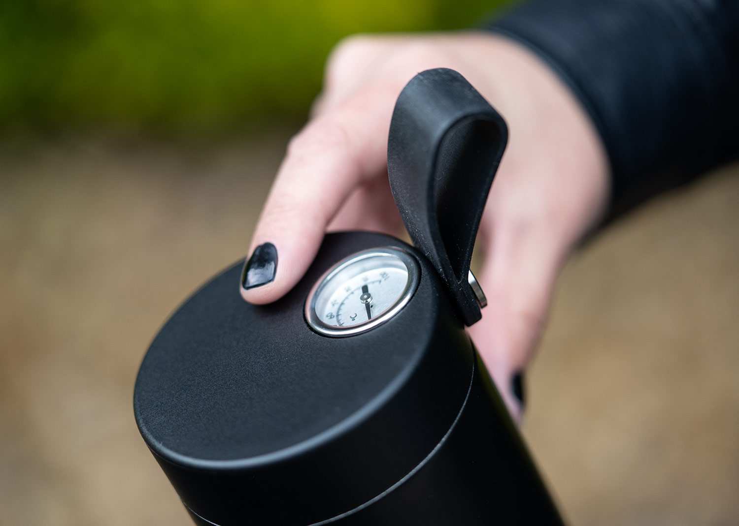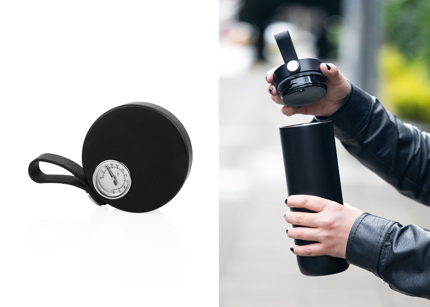 Botella Vacuum de acero inoxidable al vacío de doble pared, color mate lacado. Tapa de plástico con indicador mecánico de temperatura y asa de silicona. Capacidad: 500 ml / 17 Oz.