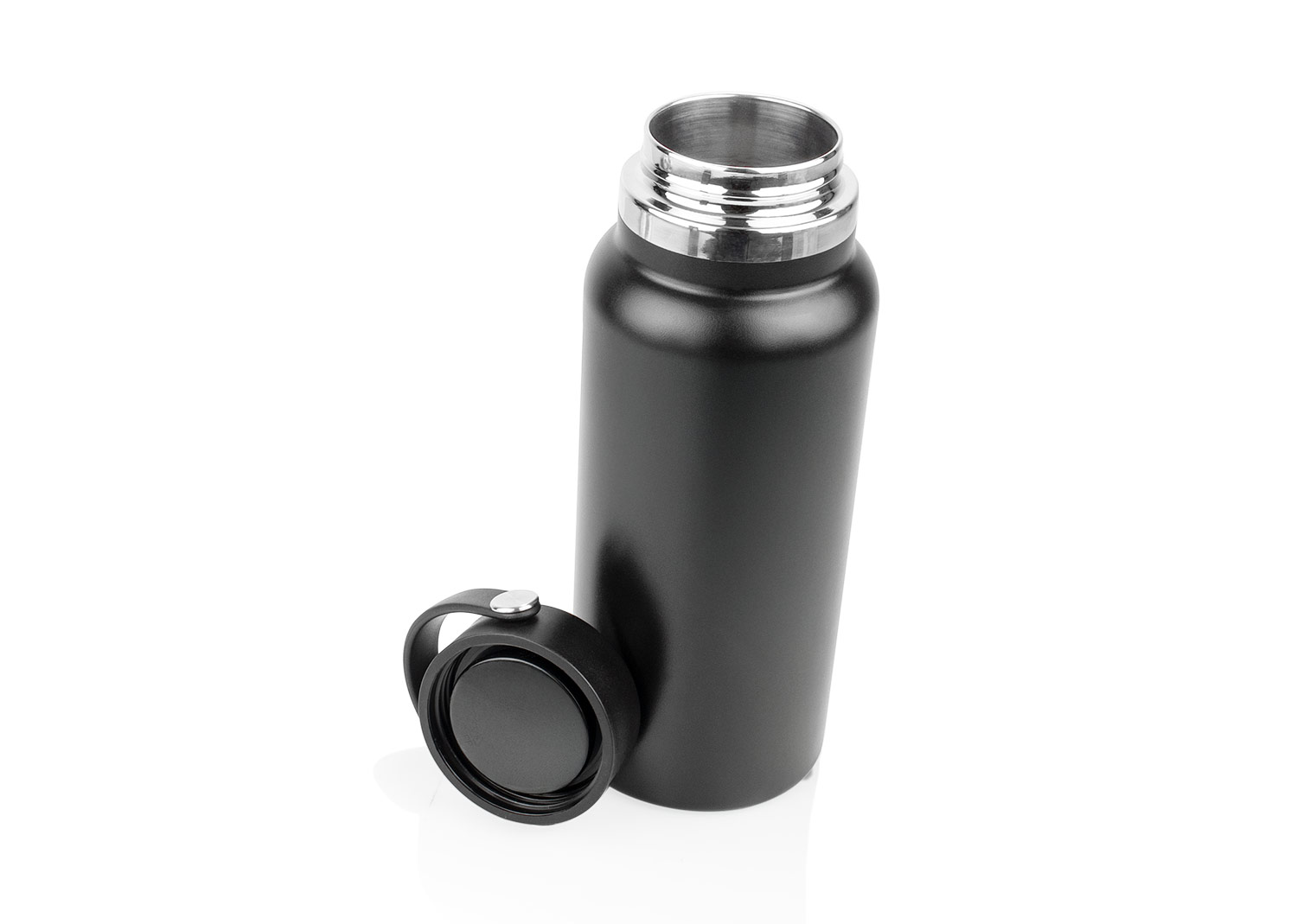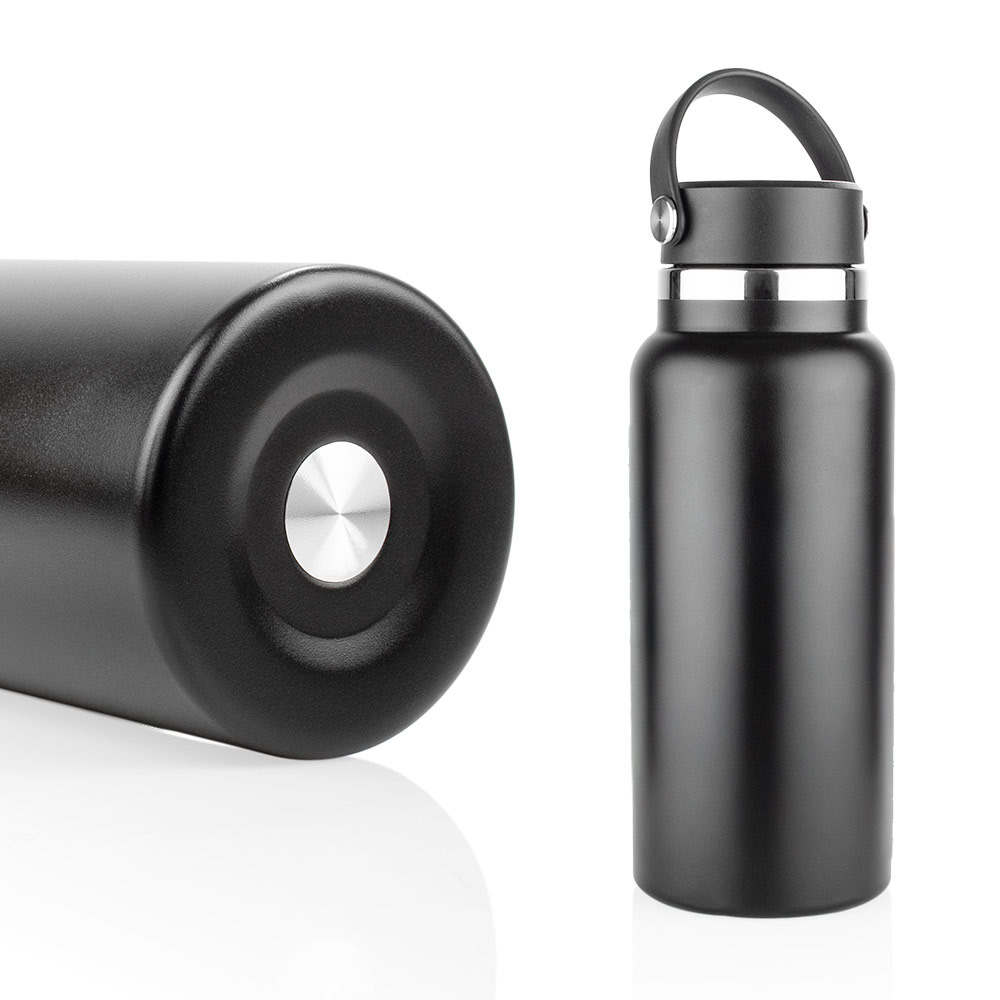 Botella para agua hecha en acero inoxidable de 32 oz/945 ml. Tapa rosca y asa plástica para facilitar su transporte.