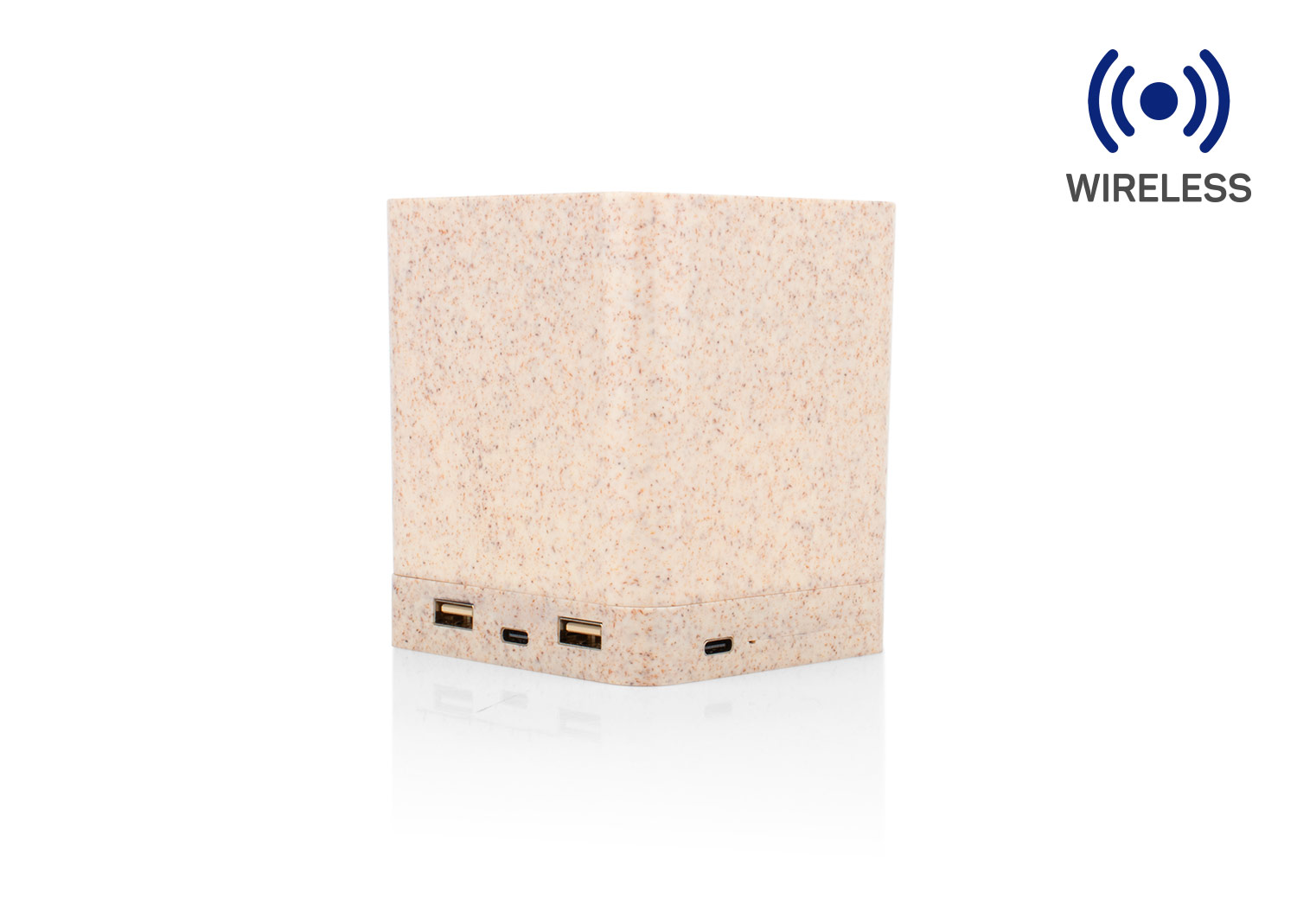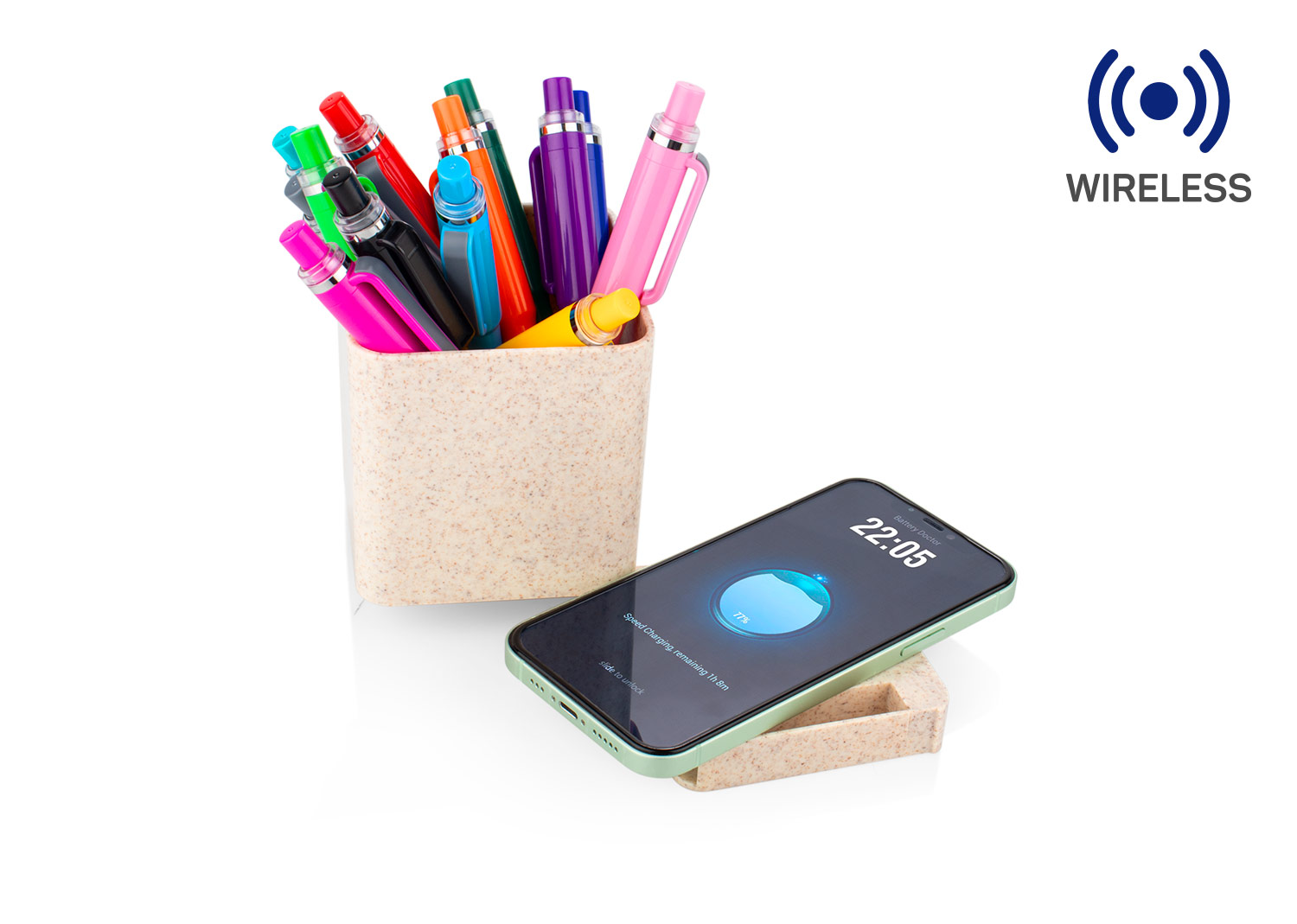 Cargador inalámbrico de 10 W + concentrador USB 2.0. Útil para almacenar artículos en su interior. Cuenta con 2 entradas tipo C. El cargador inalámbrico se obtiene de la parte inferior hacia la derecha.