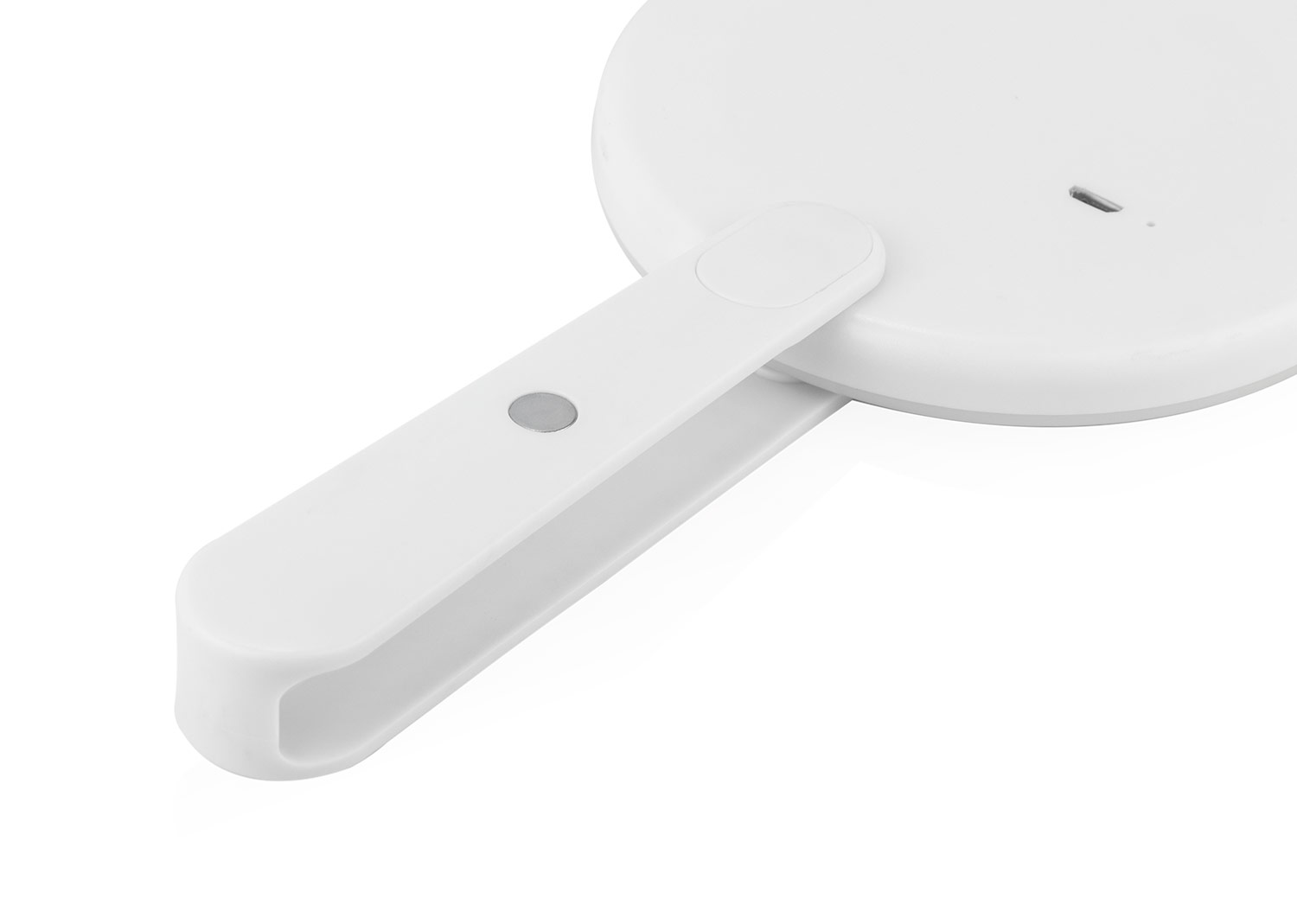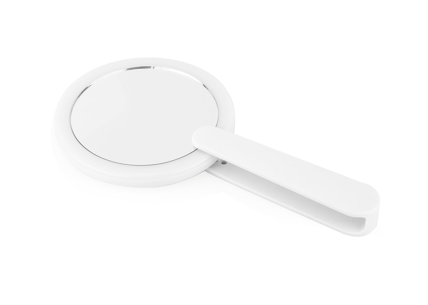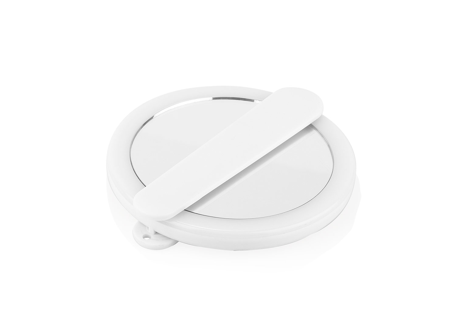 Espejo de maquillaje plegable con luz LED integrada. Cuenta con una sola luz que se activa al mover el agarre hacia un lado y se apaga automáticamente al plegar el espejo. Su diseño compacto lo hace ideal para llevar en el bolso o usar en espacios reducidos, ofreciendo iluminación práctica para retoques precisos.