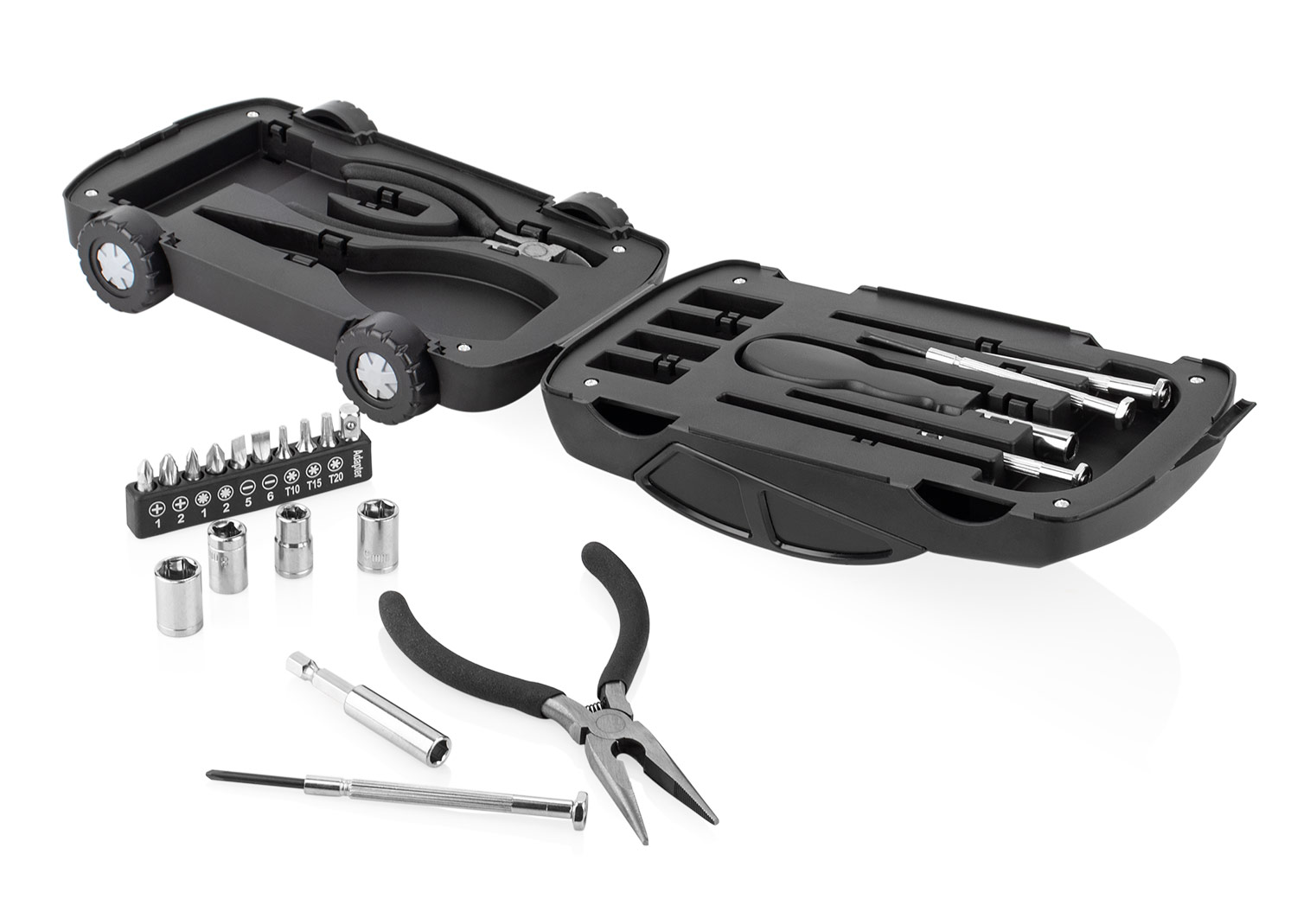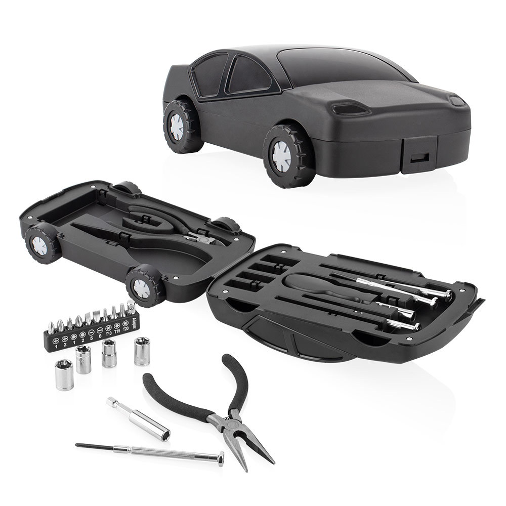 Este juego de herramientas viene en un estuche compacto con forma de automóvil, que incluye 4 piezas de precisión, un mango de destornillador (2,5 X 11,5), 4 enchufes (7 -10 mm), alicates en 2 piezas (punta y corte), un mango de junta (5,8 X Ø 0,6) y 10 puntas de destornillador. Su diseño práctico y organizado permite tener a la mano los elementos básicos para tareas de ajuste y reparación.