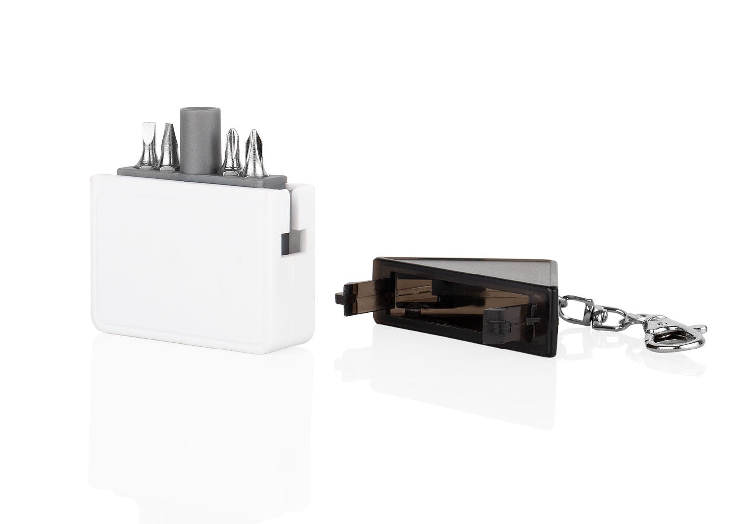 Llavero multifuncional con diseño compacto y práctico. Su sistema de apertura se activa presionando los lados para retirar la tapa, revelando en su interior 4 puntas de destornillador que se adaptan a diferentes necesidades de reparación rápida. Ideal para llevar siempre contigo gracias a su gancho metálico que permite sujetarlo fácilmente a llaves, bolsos o mochilas. Una herramienta útil y portátil que combina funcionalidad y diseño.