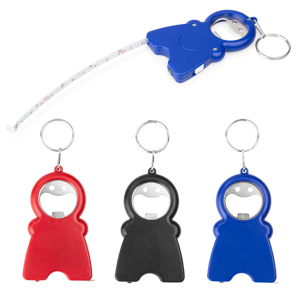 Llavero multifuncional con diseño compacto y divertido, ideal para el día a día. Incluye abrebotellas integrado en la parte superior, linterna LED que se enciende y apaga fácilmente mediante una palanca lateral, y cinta métrica de acero retráctil con doble escala de hasta 100 cm y 39 pulgadas. Su estructura resistente y su anillo metálica lo hacen práctico para llevar siempre contigo.
