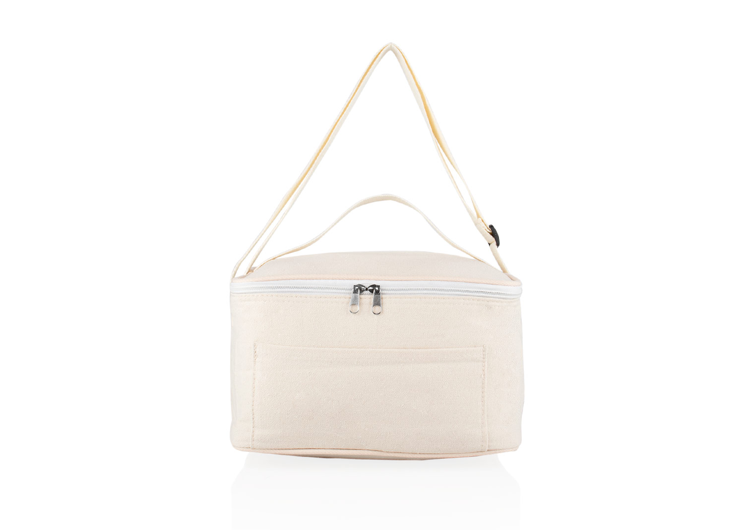 Lonchera térmica de algodón con interior de aluminio. Bolsillo frontal y asas de tela resistentes ajustables.