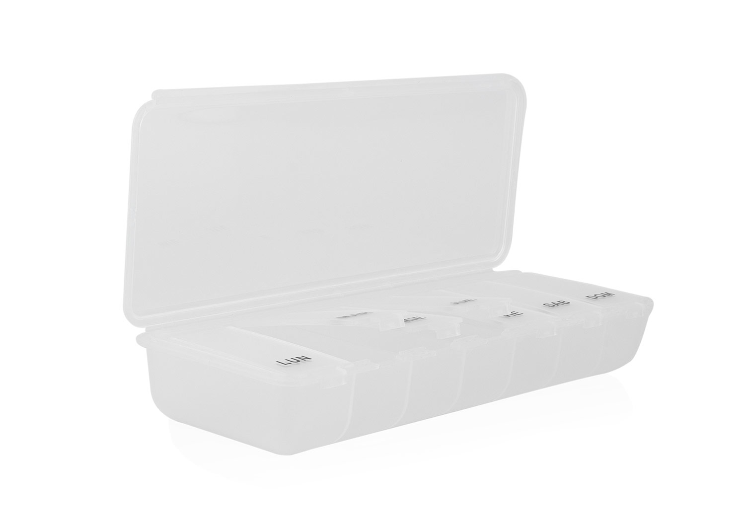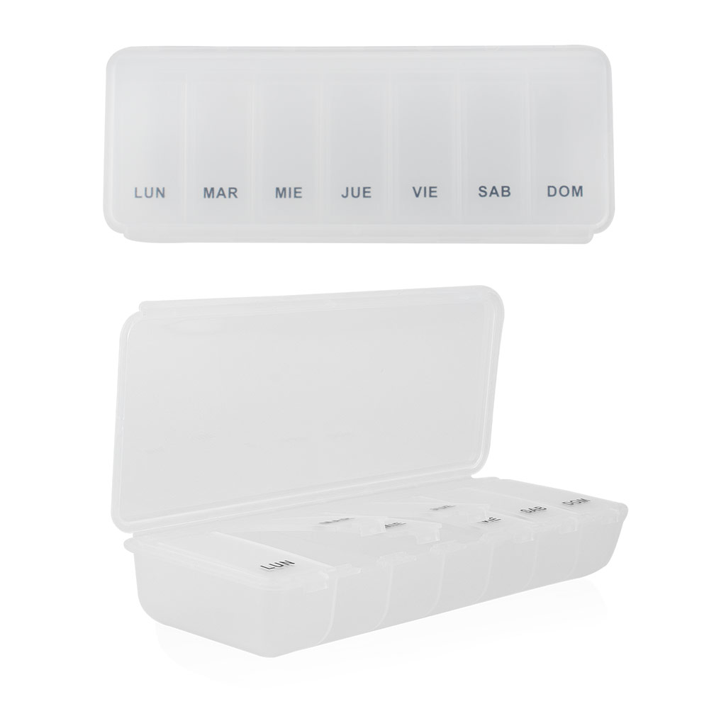 Organizador práctico para medicamentos, diseñado con 7 compartimentos individuales (6,3 X 2,1) para cada día de la semana. Fabricado en plástico transparente con tapa abatible, permite visualizar fácilmente el contenido y mantener el control diario de la dosis. Ideal para uso personal en casa o durante viajes.