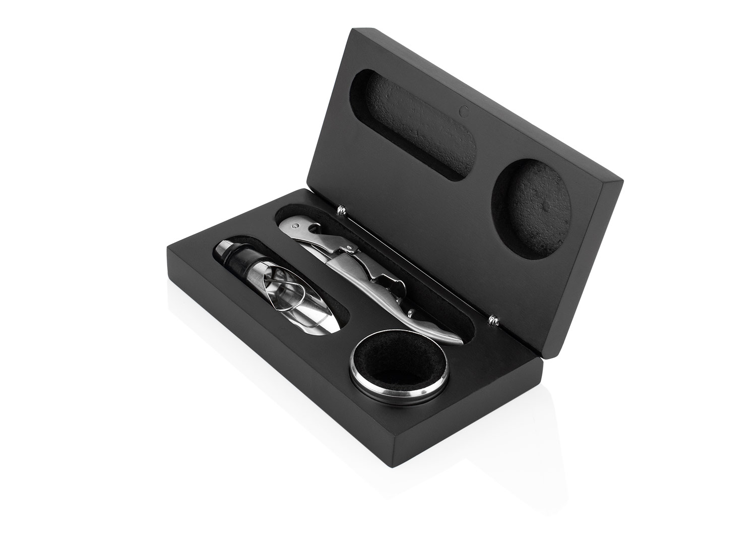Set de vino elegante presentado en estuche rígido, ideal para regalo. Incluye sacacorchos metálico multifuncional, vertedor para botella y aro antigoteo, diseñados para facilitar el servicio y conservar la presentación del vino. Un accesorio práctico y sofisticado, perfecto para amantes del vino u ocasiones especiales.