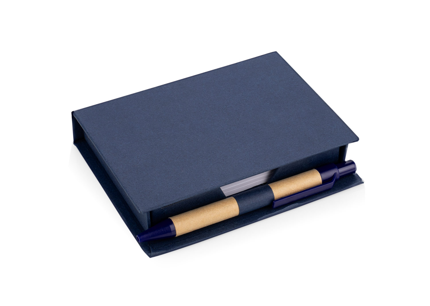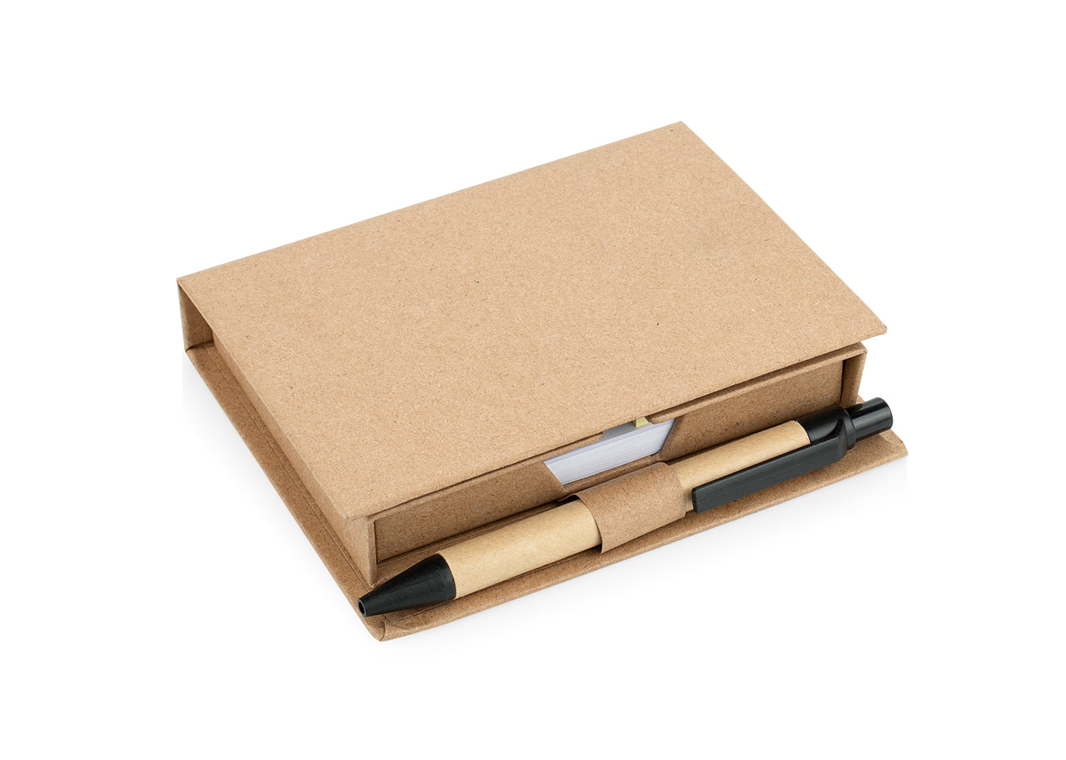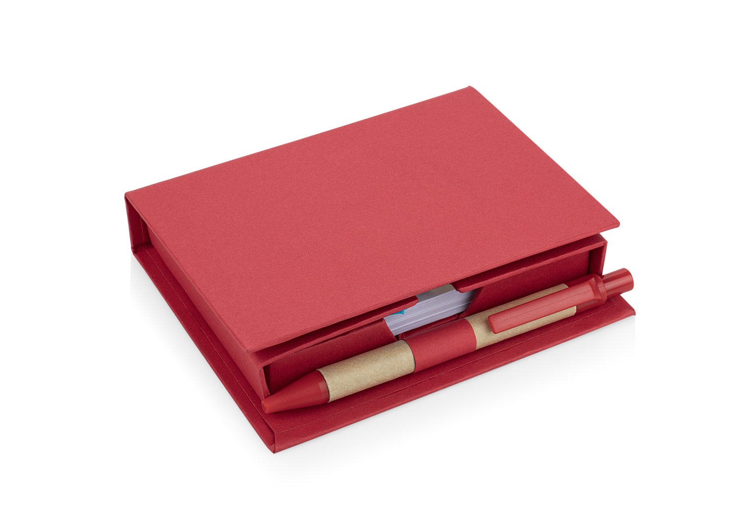 Set de escritorio, contiene: 1 bolígrafo ecológico. Regla de 12 cm, juego de banderas adhesivas de 5 colores por 25 unidades cada color, memos adhesivos por 25 unidades y 100 hojas sueltas blancas A7 aprox.