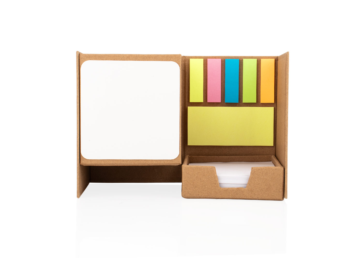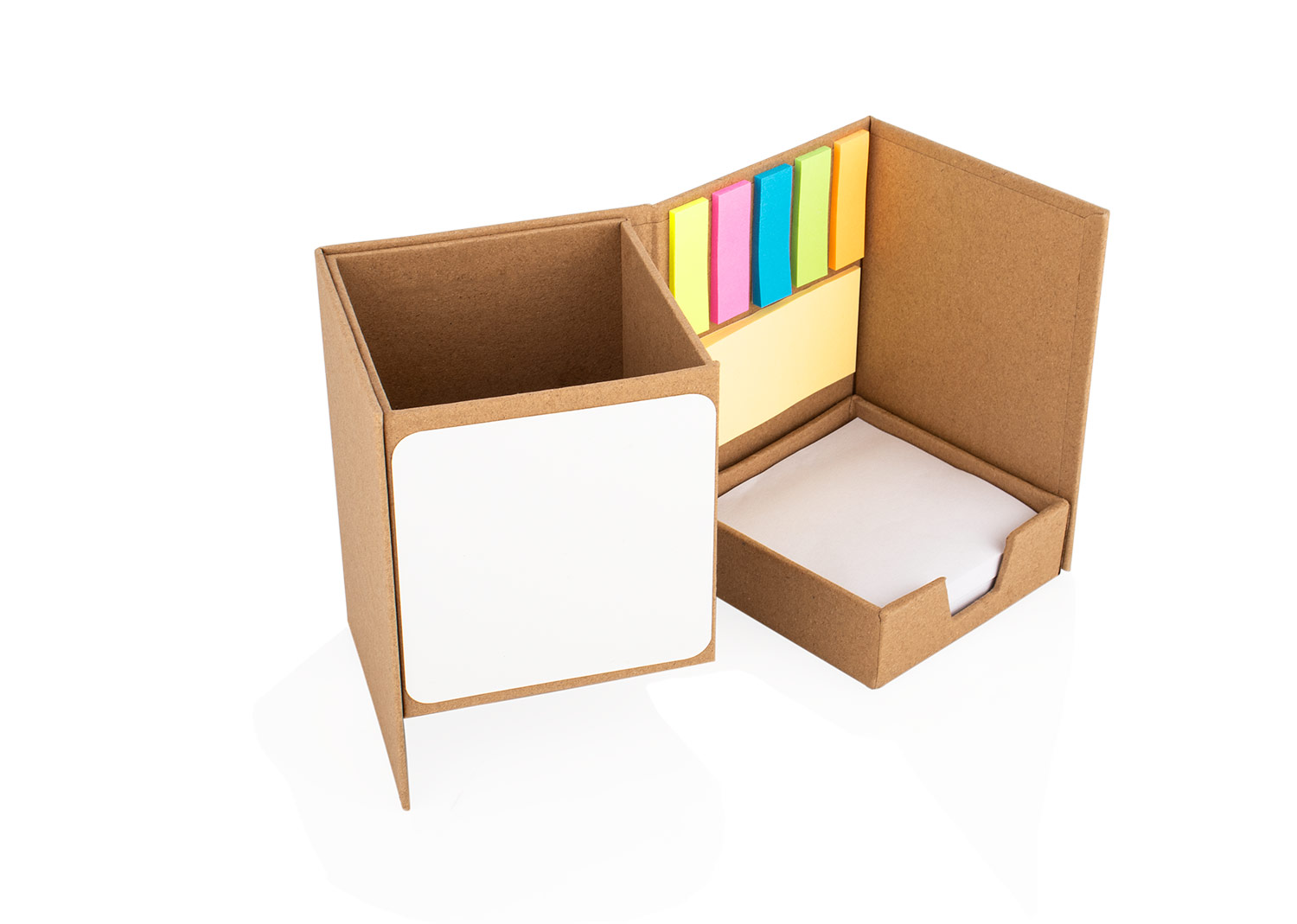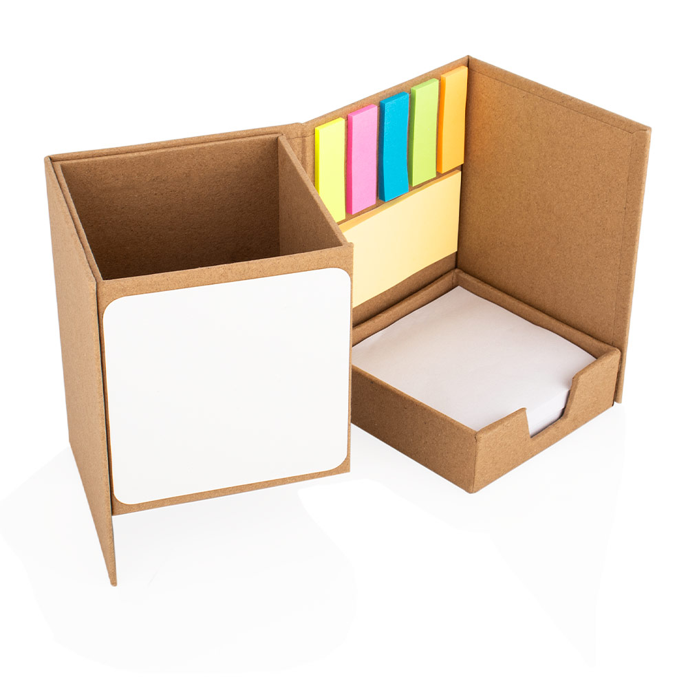 Práctico portabolígrafos multifuncional que incluye una pizarra blanca para apuntes rápidos, hojas blancas sueltas, notas adhesivas en un color y separadores adhesivos en cinco tonos diferentes para una organización más visual. Su diseño permite abrir y cerrar el set de forma lateral, ofreciendo un uso cómodo y compacto ideal para cualquier escritorio.
