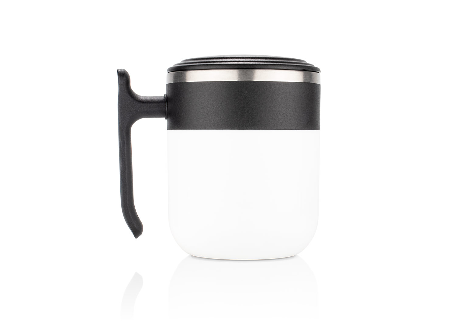 Mug térmico con tapa de cierre bajo presión. Interior en acero inoxidable que ayuda a conservar la temperatura de tus bebidas. Diseño con asa ergonómica y tapa plástica que se ajusta firmemente para evitar derrames. Capacidad: 350 ml / 12 Oz.